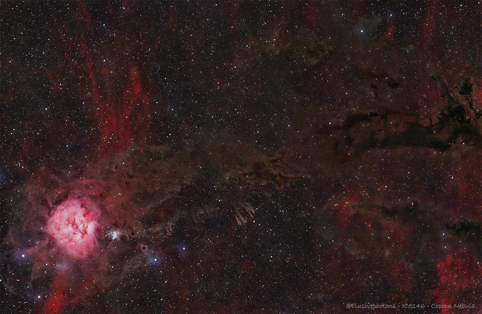 The Cocoon Nebula, catalogued as IC 5146, hangs in the northern constellation Cygnus as a compact cradle of starbirth wrapped in a sheath of dust and gas. It spans roughly 15 light-years across, with angular measurements of about 12 arcminutes translating to this true diameter, and lies on the order of 3,000 - 4,000 light-years from Earth, placing it comfortably within our Milky Way's spiral arms. Through long-exposure imaging, the nebula appears as a glowing red-pink sphere embedded at the end of a dark lane of dust (Barnard 168), creating the impression of a luminous cocoon trailing a smoky celestial tail across the sky.