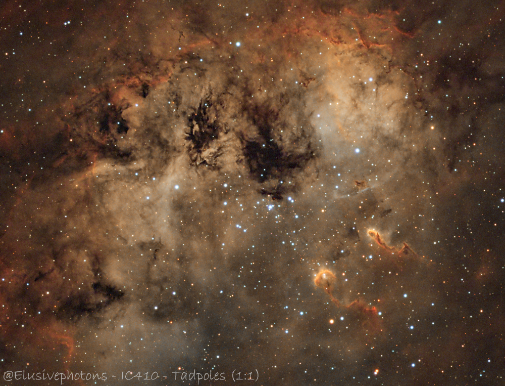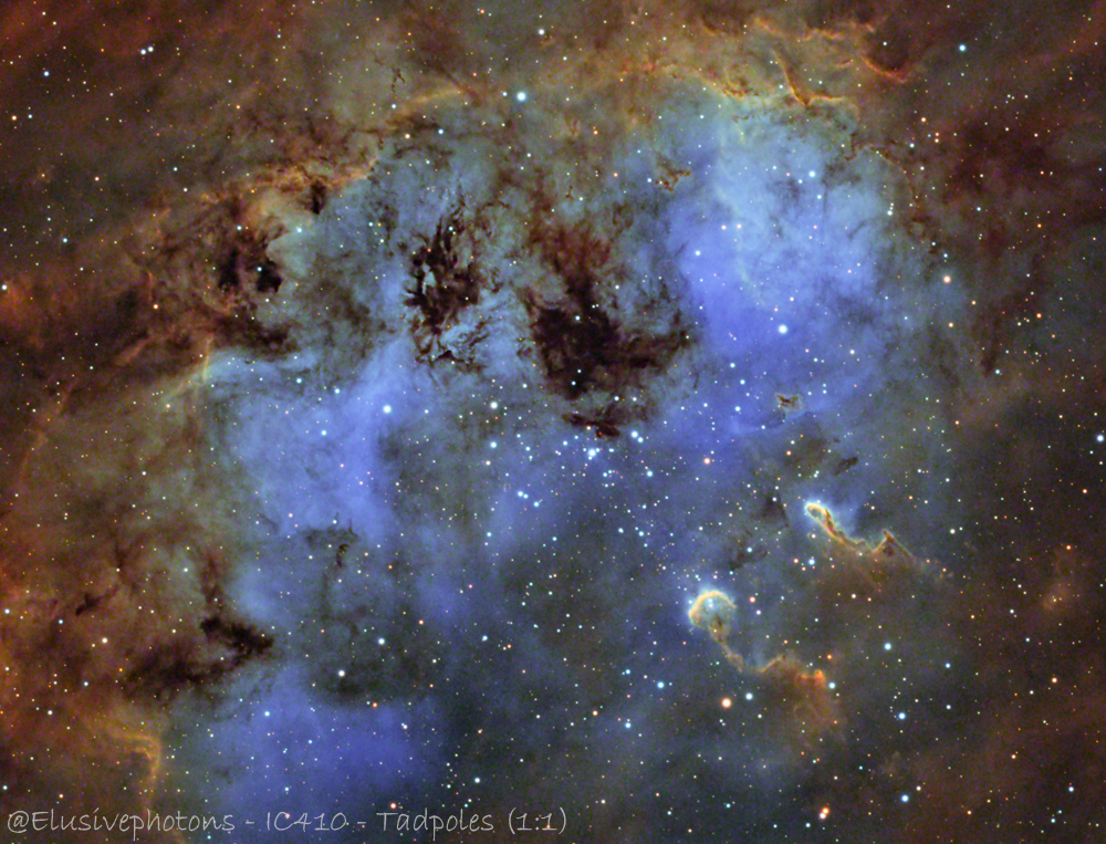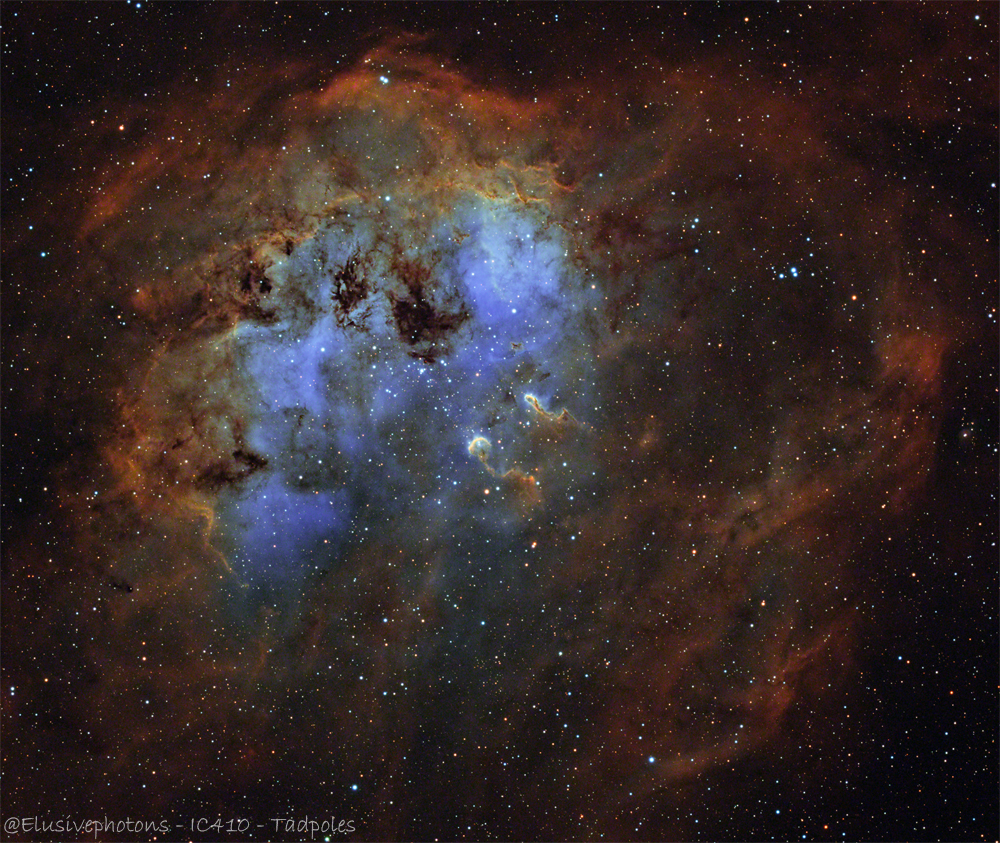 Now the fun part! While processing my recent image of IC410 - The Tadpoles Nebula, I tried a variety of color palette's before ending up with one I liked best. Below are the results of 4 different processing techniques, I found the results to be very intresting to say the least. I use a one-shot-color camera so in order to represent something similar to the hubble palette, I have to create a synthetic channel because my filters only let light in from two wavelengths, not the required three. (Halpha & Oxygen III) |