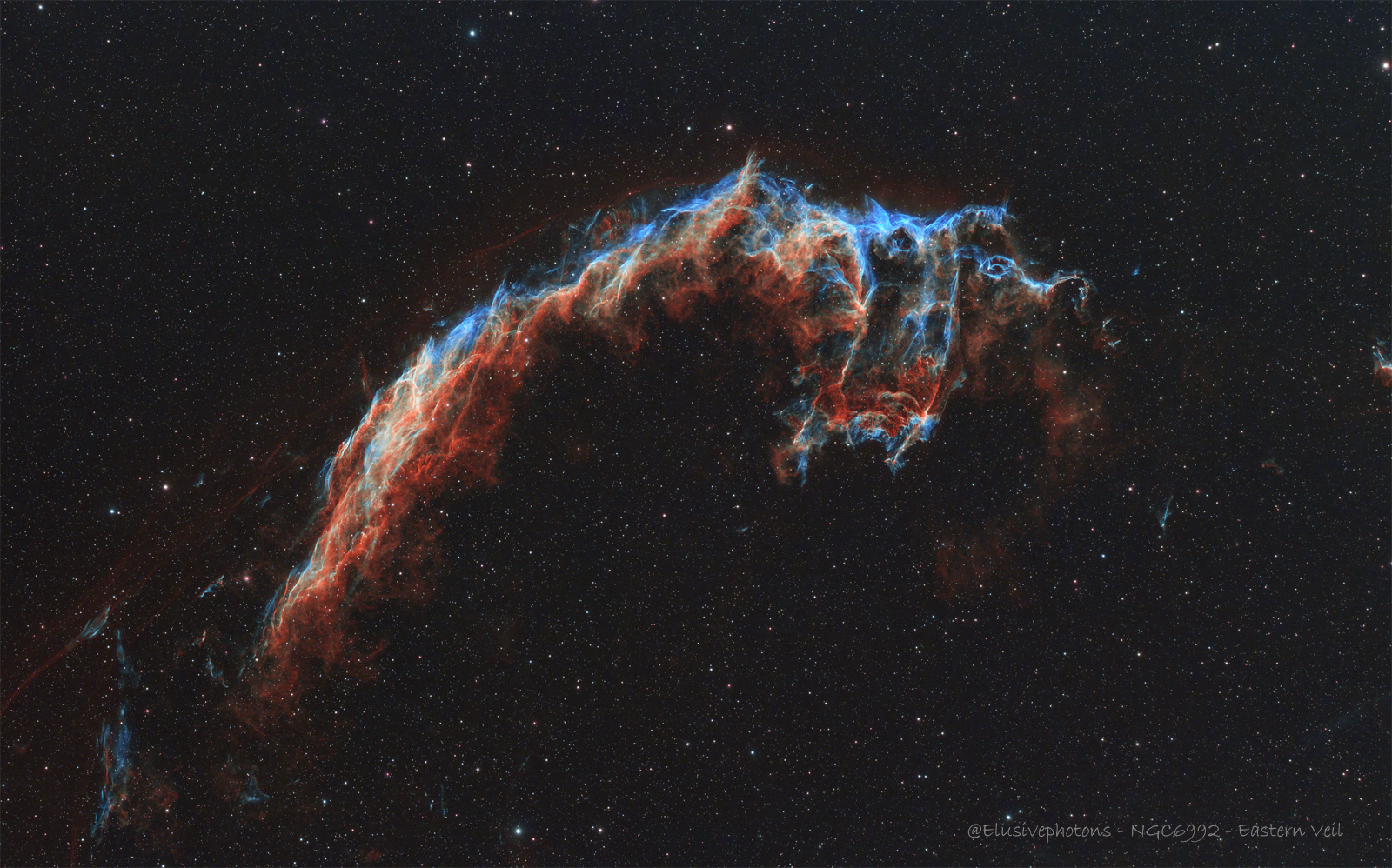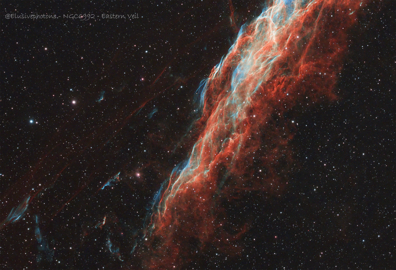NGC 6992 is a supernova remnant located in the constellation Cygnus. It is also known as the Eastern Veil Nebula, and it is part of a larger structure of dark molecular clouds that harbors many regions of nebulosity with active star formation[3]. The supernova that created NGC 6992 is estimated to have occurred around 8,000 years ago[2].