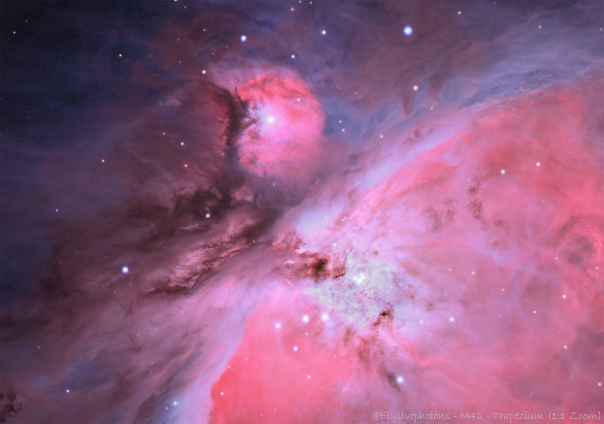 The Great Orion Nebula, also known as Messier 42 or M42, is a remarkable stellar nursery located in the Orion Constellation, approximately 1,350 light-years away from Earth[1][2]. This cosmic wonder is about 2 million years old and spans around 24 light-years across, emitting a beautiful bluish/greenish hue from ionized oxygen, along with red and blue shades from hydrogen and other elements[1]. Within the Orion Nebula lies the Trapezium Cluster, consisting of four bright stars that illuminate and shape the nebula with their intense radiation[1]. This nebula is part of the larger Orion Molecular Cloud Complex, one of the most active star-forming regions visible in the sky[1].