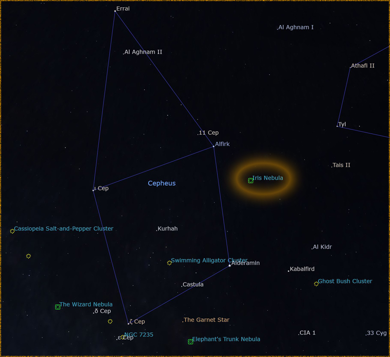 The Iris Nebula, also known as NGC 7023 and Caldwell 4, is a bright reflection nebula located in the constellation Cepheus. It is one of the most photographed objects in the night sky due to its vibrant colors and striking appearance. The nebula measures about six light-years across and is illuminated by a young, hot star at its center.