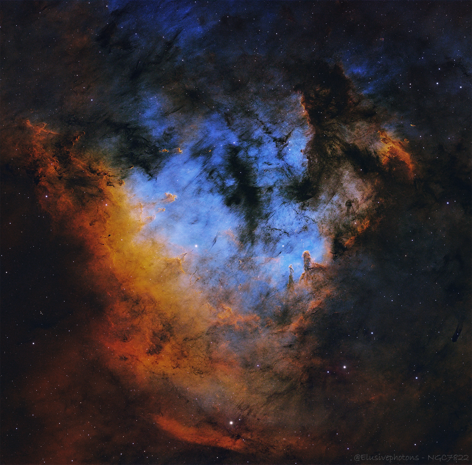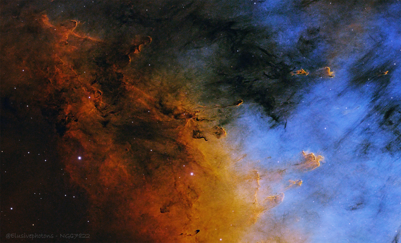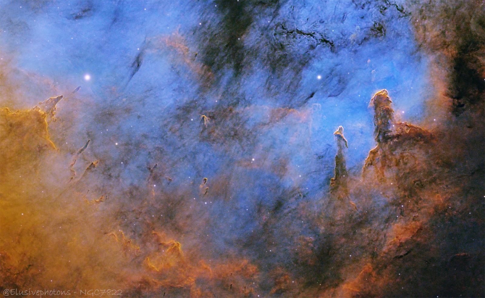 At the core lies the open cluster Berkeley 59, only a few million years old, embedded within the emission region Sharpless 171 that forms the bright center of NGC 7822.[1][2] Its dominant member, the star BD+66 1673, is an O-type eclipsing binary with a surface temperature of about 45,000 K and a luminosity roughly 100,000 times that of the Sun, making it one of the hottest stars discovered within about 1 kiloparsec of our Solar System.[2] Intense ultraviolet radiation from this powerhouse ionizes vast swaths of hydrogen gas, causing the nebula to glow while simultaneously eroding nearby clouds into curling ridges, elephant trunks, and needle-like spires that all seem to bend away from their blinding source.[1]