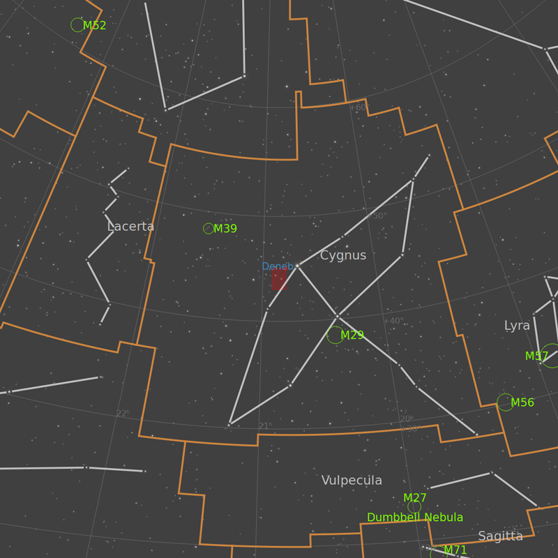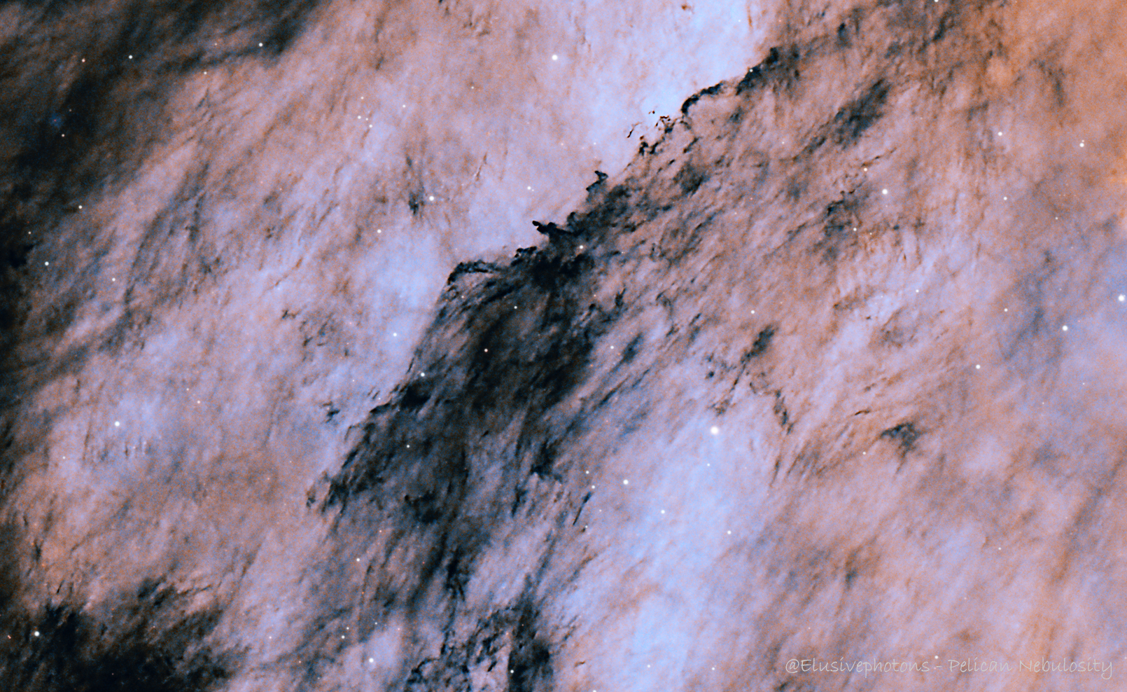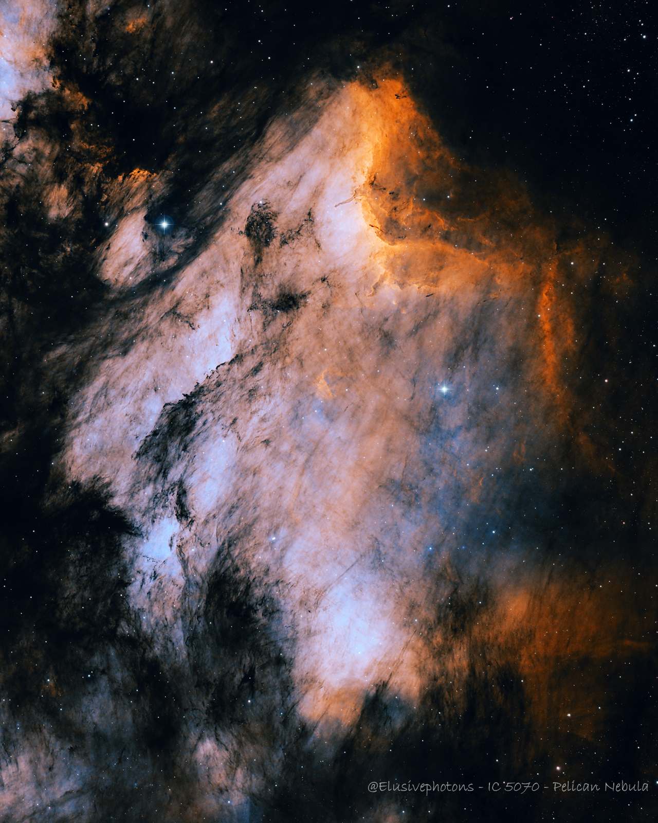 The Pelican Nebula, designated as both IC 5070 and IC 5067, is a vast cloud of gas and dust, stretching over 10 light-years in diameter(1). Despite its size, IC 5070 is not visible to the naked eye, as its gases are spread out and quite dim. However, with a pair of binoculars or a small telescope (e.g., 3"), observers can catch a glimpse of this nebula as a faint patch of gray light(1). The Pelican Nebula is located near another famous nebula, the North America Nebula, and is separated from it by a dark molecular cloud known as the "Cygnus Wall"(1).