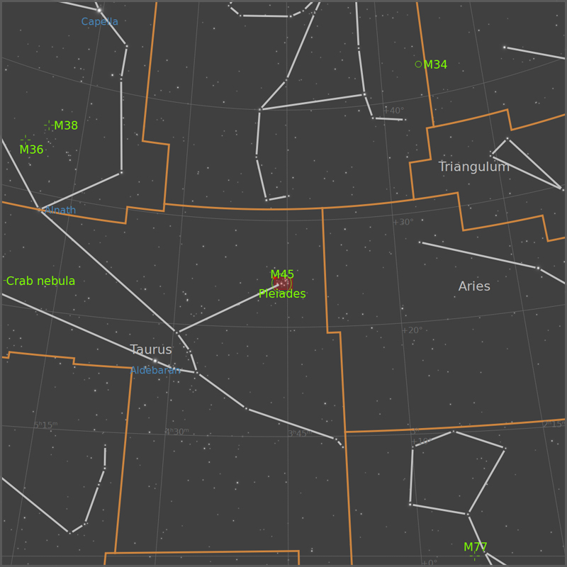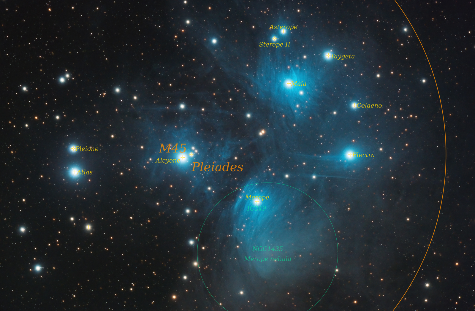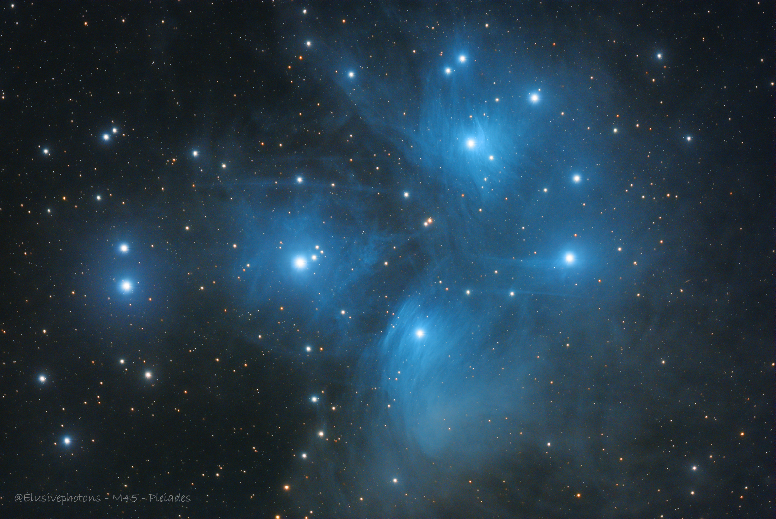Messier 45, also known as the Pleiades, is one of the most stunning and fascinating objects in the night sky. Located in the constellation of Taurus, this open cluster is made up of hundreds of stars, and is estimated to be around 100 million years old. It is also relatively close to Earth, at a distance of around 440 light-years, making it easily visible to the naked eye. The cluster's most striking feature is its blue reflection nebula, which is created by the light of the brightest stars in the cluster reflecting off of dust and gas in the region. The nebula gives the cluster a distinct, ethereal glow, making it a favorite among stargazers and astrophotographers alike.