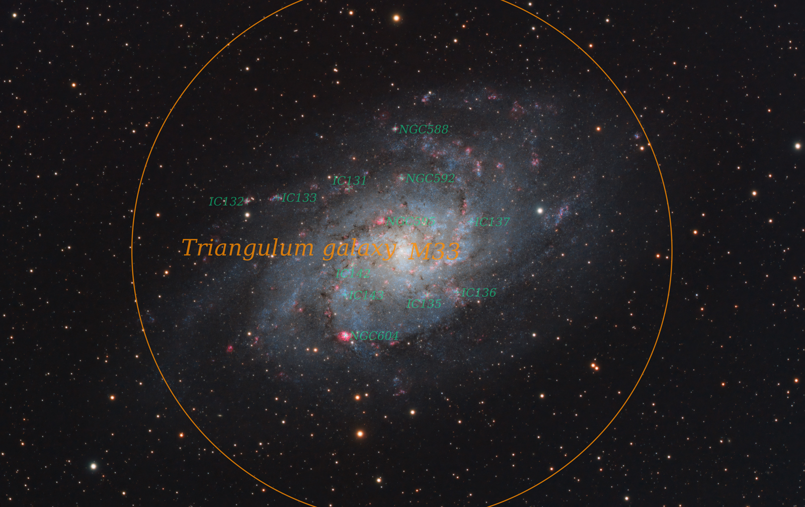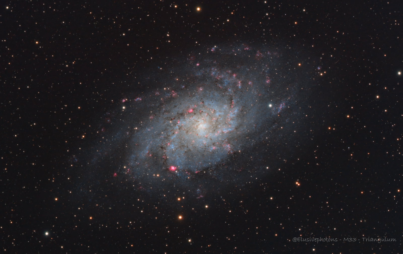The Triangulum Galaxy, also known as M33, is a distant and fascinating member of the Local Group, a cluster of galaxies that includes the Milky Way and Andromeda. Located approximately 3 million light-years away in the constellation Triangulum, it is the third-largest galaxy in the Local Group, with a diameter of approximately 60,000 light-years. Despite its distance, the Triangulum Galaxy has been extensively studied by astronomers, who have uncovered a range of intriguing features, including a central bar, spiral arms studded with bright nebulae and young stars, and regions of dense gas and dust that may be on the cusp of forming new star clusters.