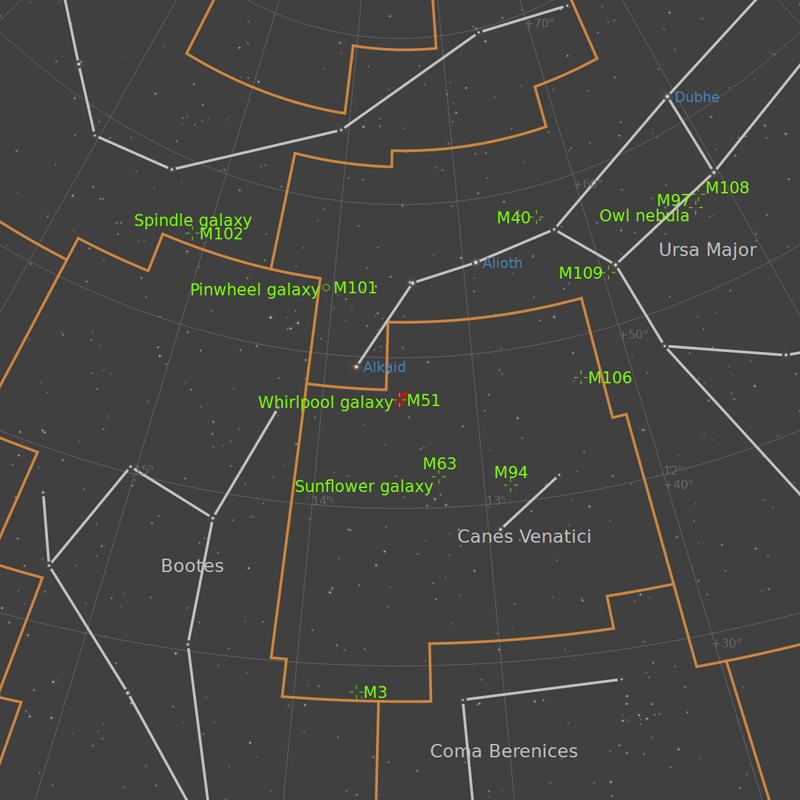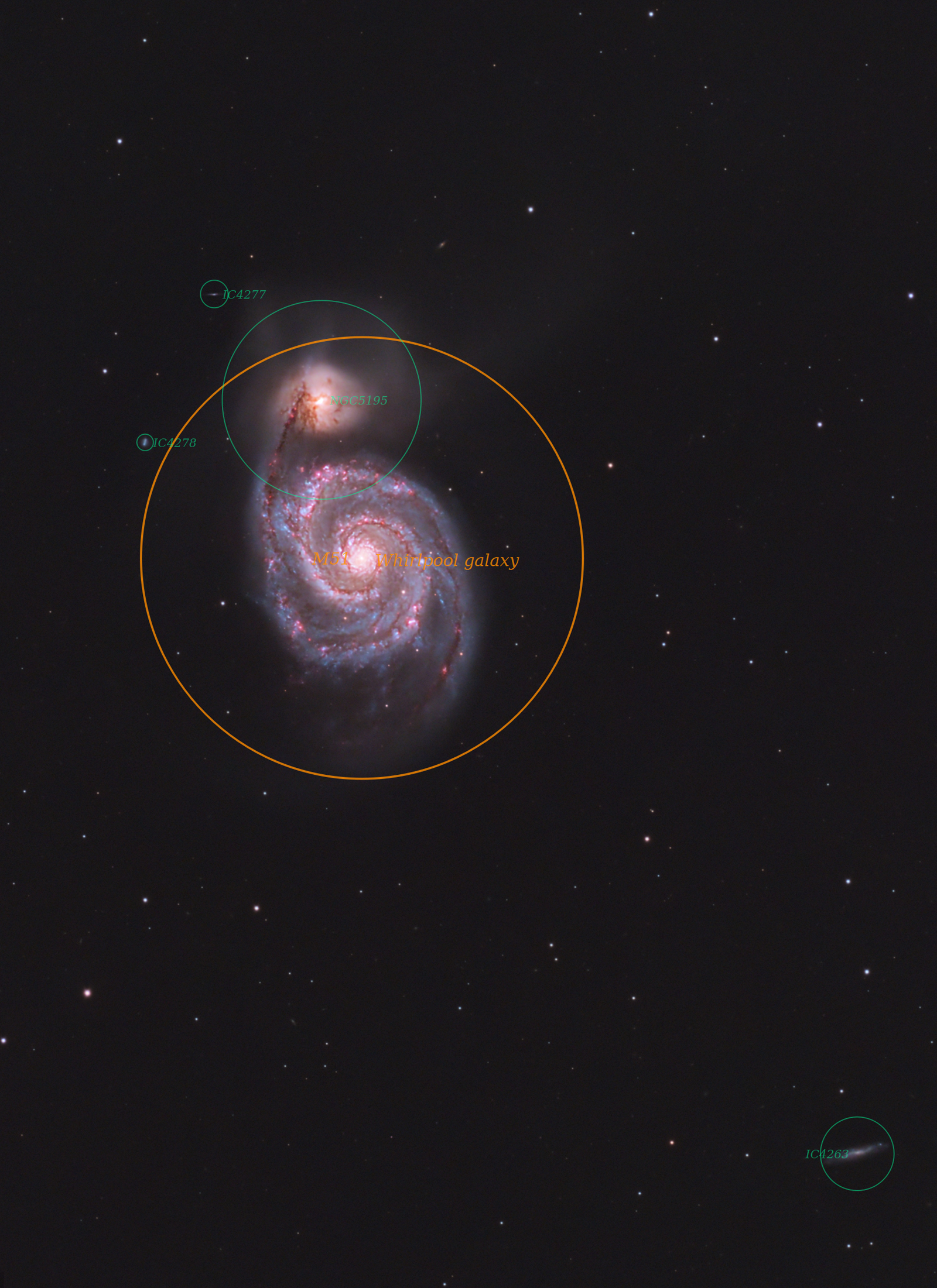 The Whirlpool Galaxy, also known as Messier 51 or M51, is a stunning spiral galaxy located about 31 million light-years away in the constellation Canes Venatici. It is one of the most famous and photogenic galaxies in the night sky, and its distinctive spiral arms and swirling patterns make it a favorite target for astronomers and astrophotographers alike. With a diameter of about 75,000 light-years, the Whirlpool Galaxy is roughly the same size of our own Milky Way galaxy, and it contains over 100 billion stars.
